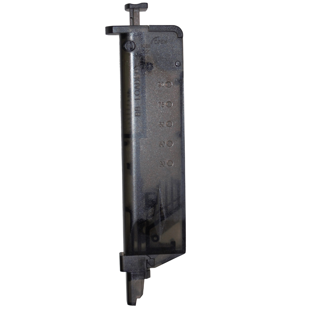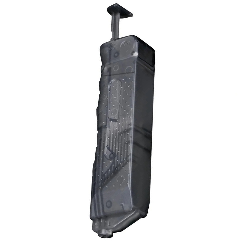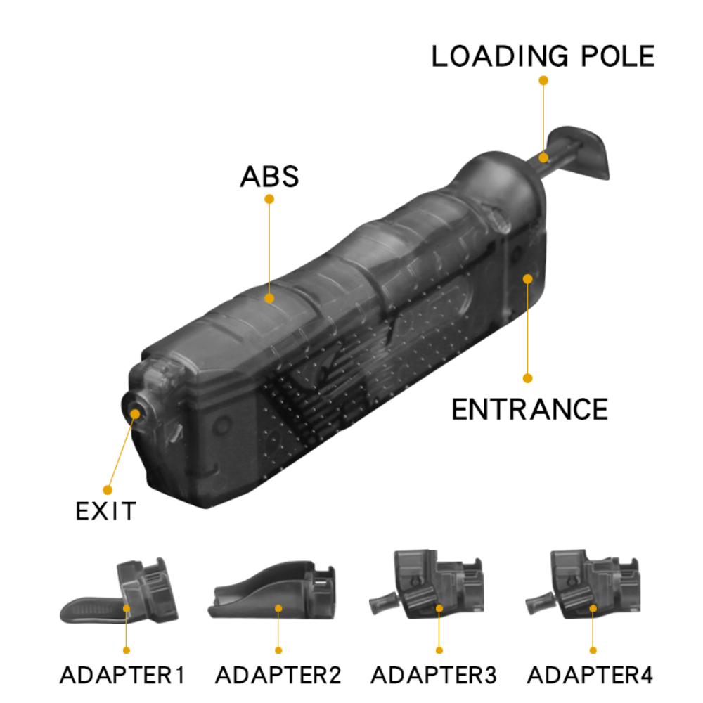 A very useful BB loader. Fill it with up to 100 BBs, then simply press the plunger while holding it to your magazine and 4 BBs are loaded at a time. Shaped like a standard double-stack pistol magazine, it will fit into most magazine pouches, and therefore easy to bring with you into the field. Great for pistol magazines.