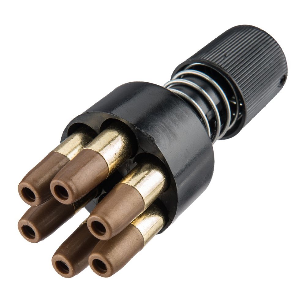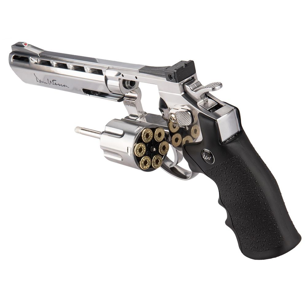 Impressive and elegant. This powerful 6” Chrome revolver licensed by Dan Wesson, draws attention and packs a big punch. It has authentic markings and a individual serial number stamped into the frame. The revolver features a double action trigger system and adjustable rear sight for extra realism and accuracy. The Dan Wesson revolver is made entirely of metal except for the ergonomic grip constructed in hard ABS plastic. The 12g CO2 cartridge is stored in the grip and is easily accessed by sliding the grip back. Each of the 6 cartridges holds one BB and is placed in the metal cylinder that rotates as each round is fired. The package includes six cartirdges and a revolver speedloader.