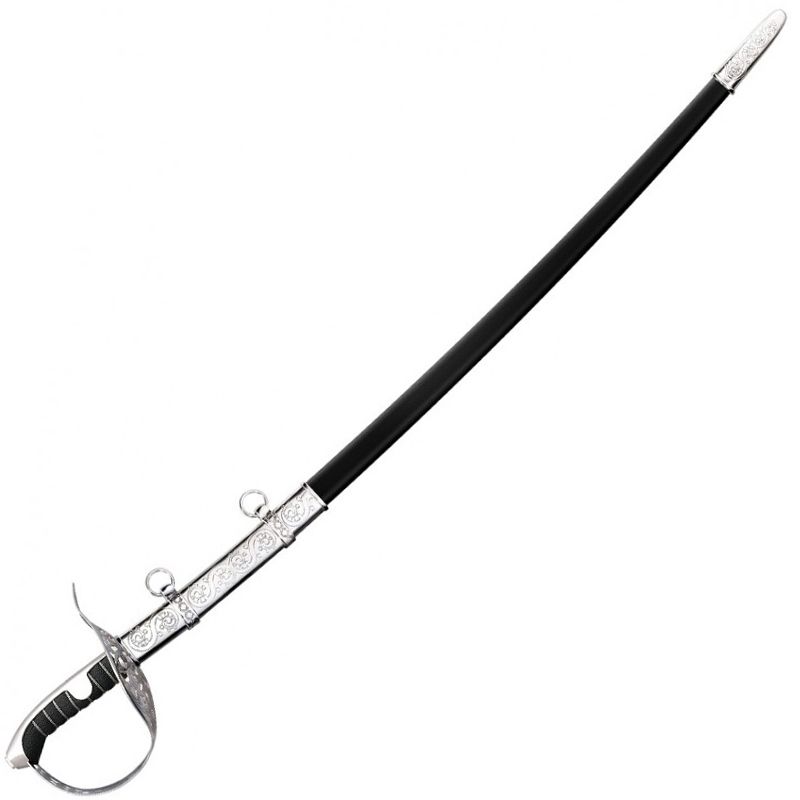 The elaborately formed guard and grip plate are steel and the grip is imitation rayskin with inlaid bands of braided wire. The sword comes with a sheath of durable leather with a steel chape and locket. Two hanging rings complete the scabbard and these can be used to attach the sword to hangers to sling it from a sword belt.