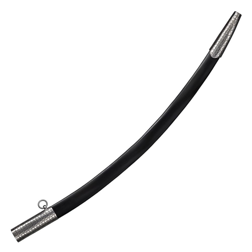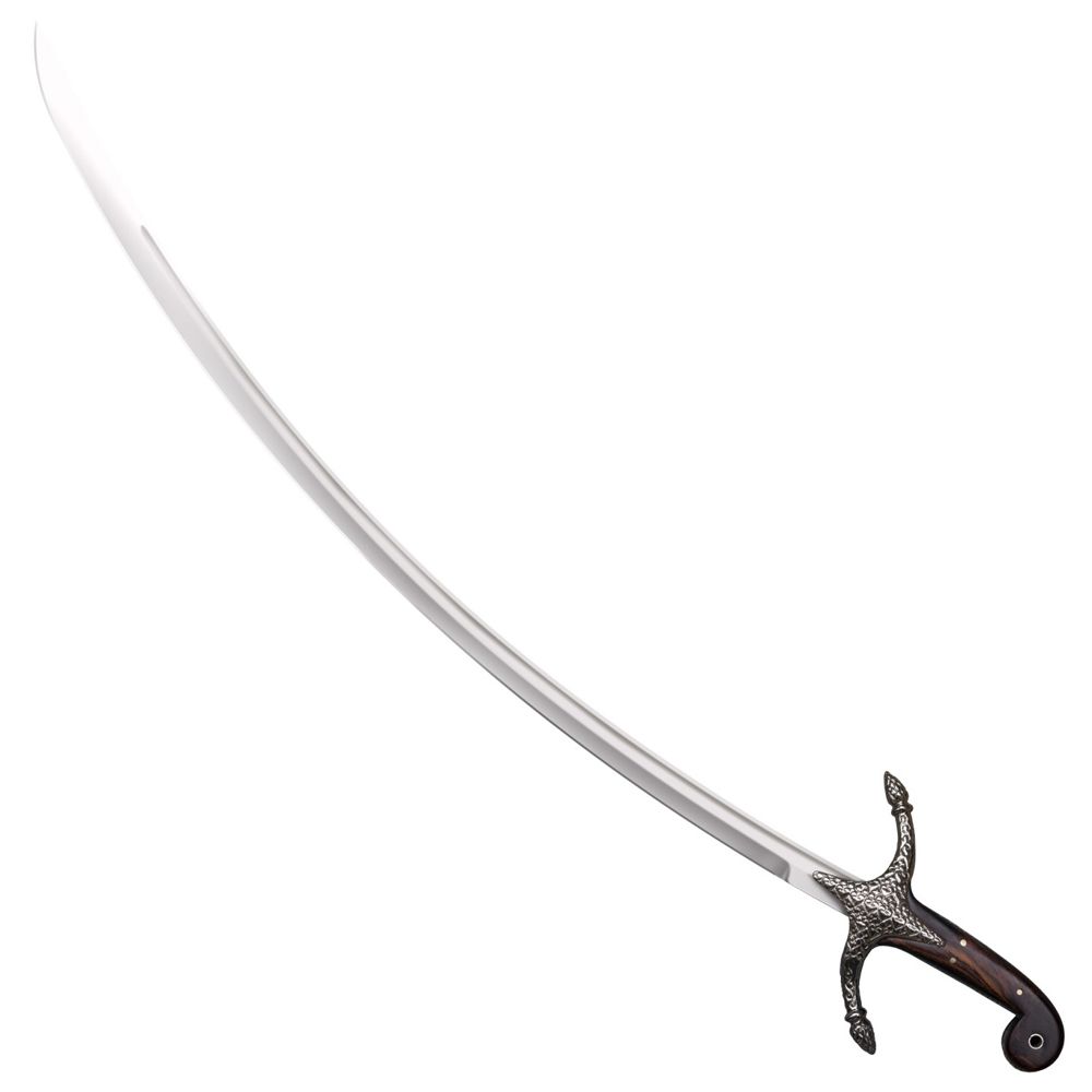 Inspired by highly decorative antique Persian blades, Cold Steel’s latest Scimitar is a true Eastern jewel! Its handsome blade is deeply curved to facilitate the devastating draw cut, and beautifully polished with a wide, deep fuller. Made from expertly heat treated 1065 carbon steel, it is perfectly balanced and hand honed to a keen edge! The Scimitar’s large S-guard and tang are intricately engraved and the dark rosewood handle scales are securely held in place with three sturdy brass pins. The bulbous pommel features a brass inlaid hole for a cord, lanyard or sash. The Scimitar is supplied complete with a thick hand stitched leather scabbard with etched steel throat, chape and carrying rings.