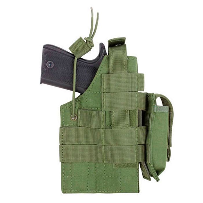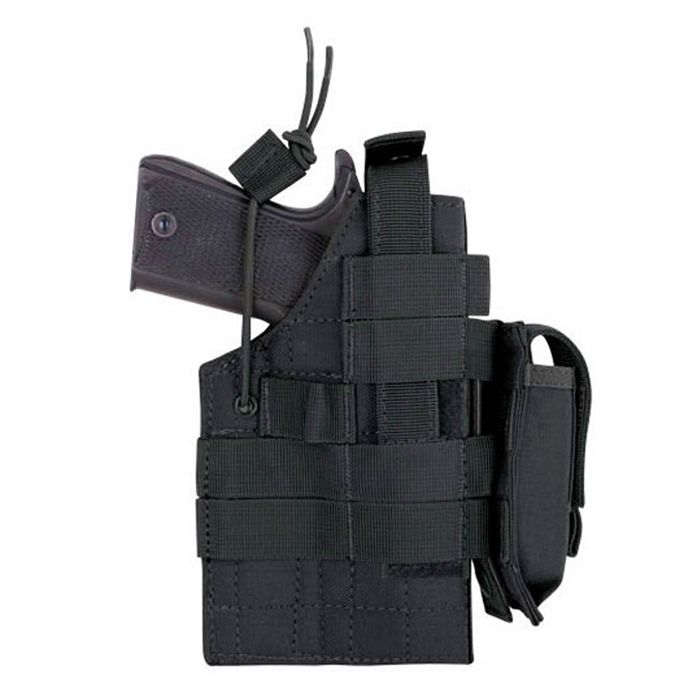 Gear up for combat with the Condor 1911 Ambidextrous Holster. This MOLLE compatible holster is designed to hold 1911 style pistols, and can be directly attached to a tactical vest or belt for easy carry. Black colour is stain resistant and conceals well at night. Extra mag pouch is included.