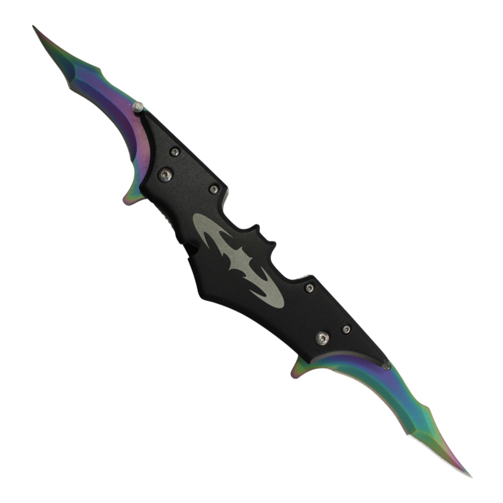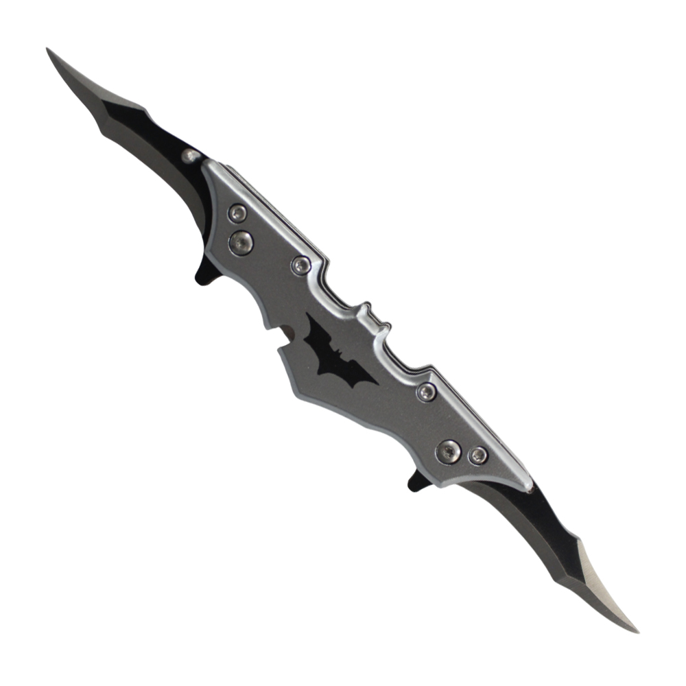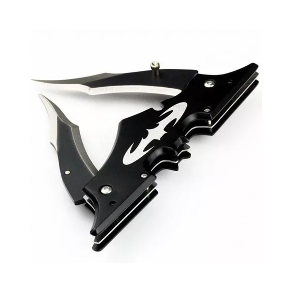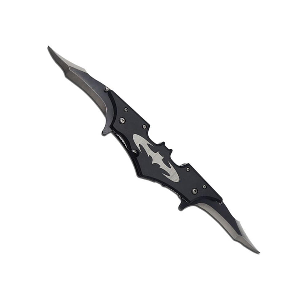 The Dual Blade Assisted Bat Knife is a uniquely designed folding knife featuring a bat-wing-inspired dual-blade system. With an aluminum handle and assisted opening mechanism, this knife is both functional and eye-catching.