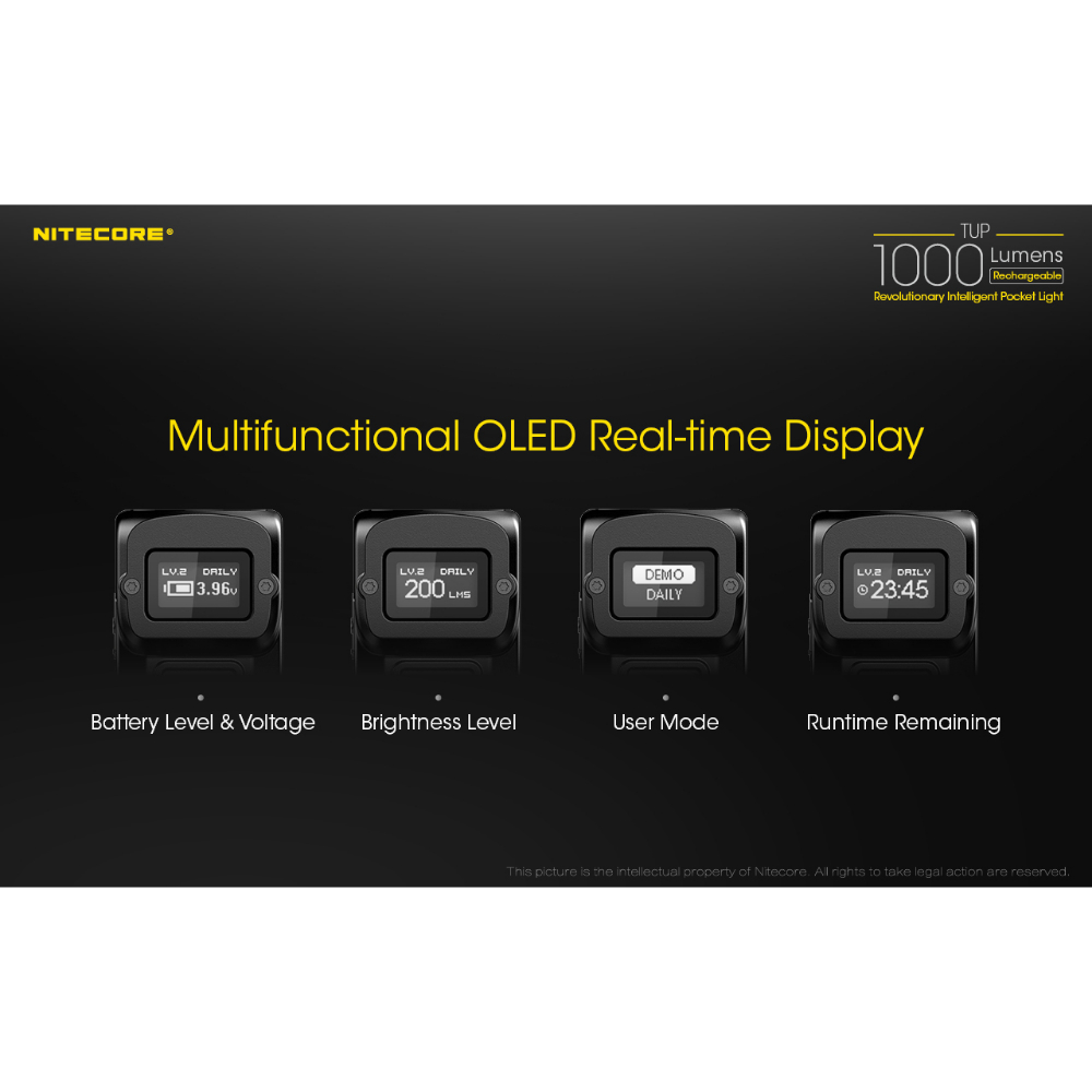 The TUP showcases an OLED display providing key information including brightness level, mode, lumen, battery voltage, runtime and lockout status. USB rechargeable with a 1200mAh li-ion battery allows this powerful keychain flashlight to reach a maximum runtime of 70 hours on a single charge.