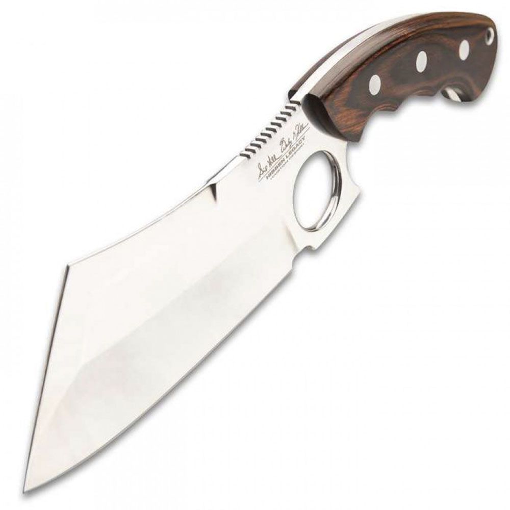 Knife Masters Gil and Wes Hibben continue to put out innovative designs, which become legends in their own right! The Hibben Legacy Bloodwood Cleaver Knife is all about having supreme control from the finger-grooved handle that fits comfortably in your palm to the finger ring integrated into the capable blade design. It has a 5 7/8", full-tang 5Cr15MoV stainless steel cleaver blade with a mirror-polished finish and beveled edges. The reddish brown wooden handle scales are secured to the tang with heavy-duty stainless steel pins and there is a lanyard hole. The 10 3/4" overall cleaver knife can be carried and stored in its premium black leather belt sheath, which has the Hibben Knives logo.