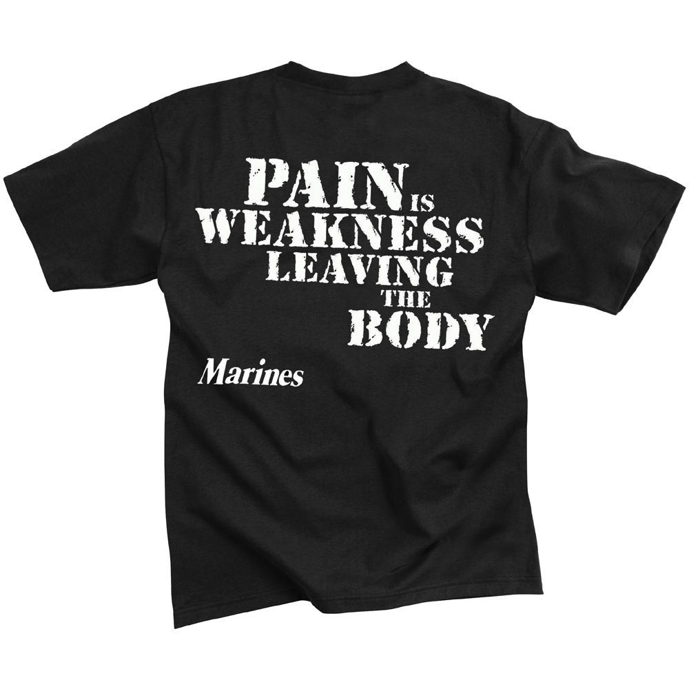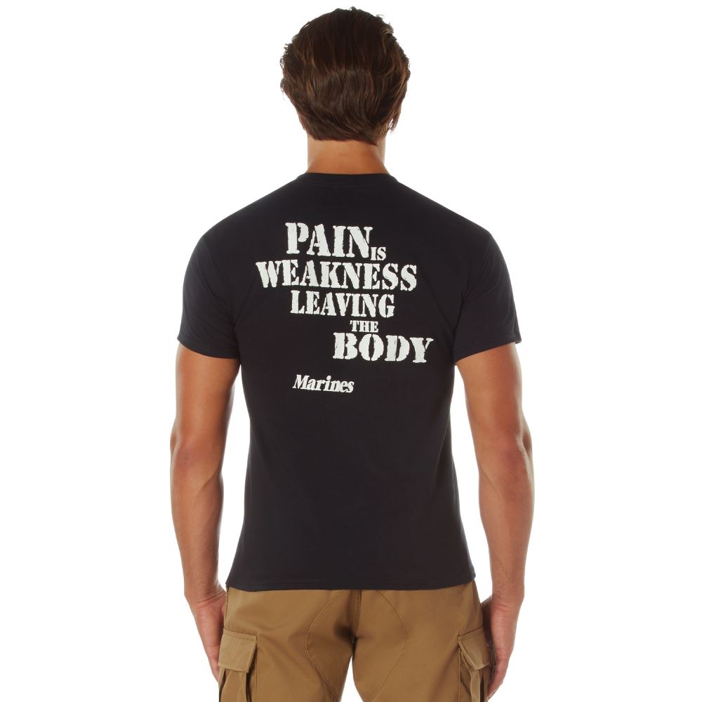 licensed by U.S. Marines Pain is Weakness T-shirt features a two sided print with a Marines logo on the front chest and Pain is Weakness slogan on the back.