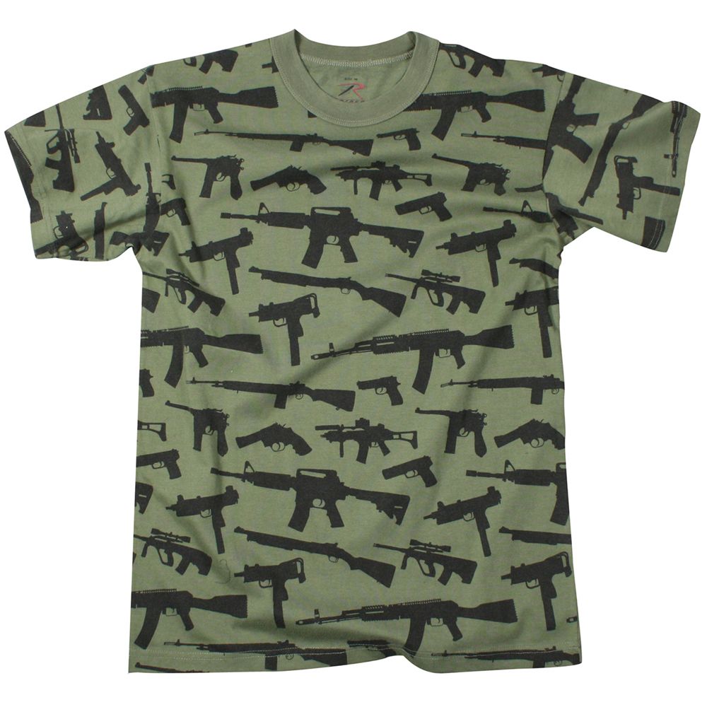 Dress up yourself like a true militant man with these Multi Print Guns T-shirts. The entire T-shirt comes with mini guns printed all over it on olive drab and black background, a color that speaks of GI style. The gun print includes various types of rifle motifs. This short sleeved olive T-shirt is made from best grade cotton and polyester mix material that gives you comfort and feels soft against your skin. The neck label comes in black and red and has no tags, which adds to the comfort. This T-shirt offers a vintage look to suit the style of any robust man