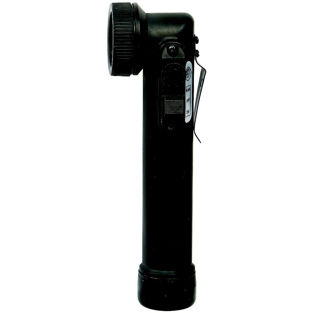 Mini Led Army Style Flashlight features an angled head, 6 Led bulbs (3-clear, 1-red, 1-blue, 1-green), a metal belt clip and fits perfectly into ’s duty belt compatible flashlight holder. Composed of waterproof material, and equipped with a burning time of 30 hours; this army style flashlight is the go-to for all military, tactical, and outdoor uses. This flashlight requires 2AA batteries (not included).