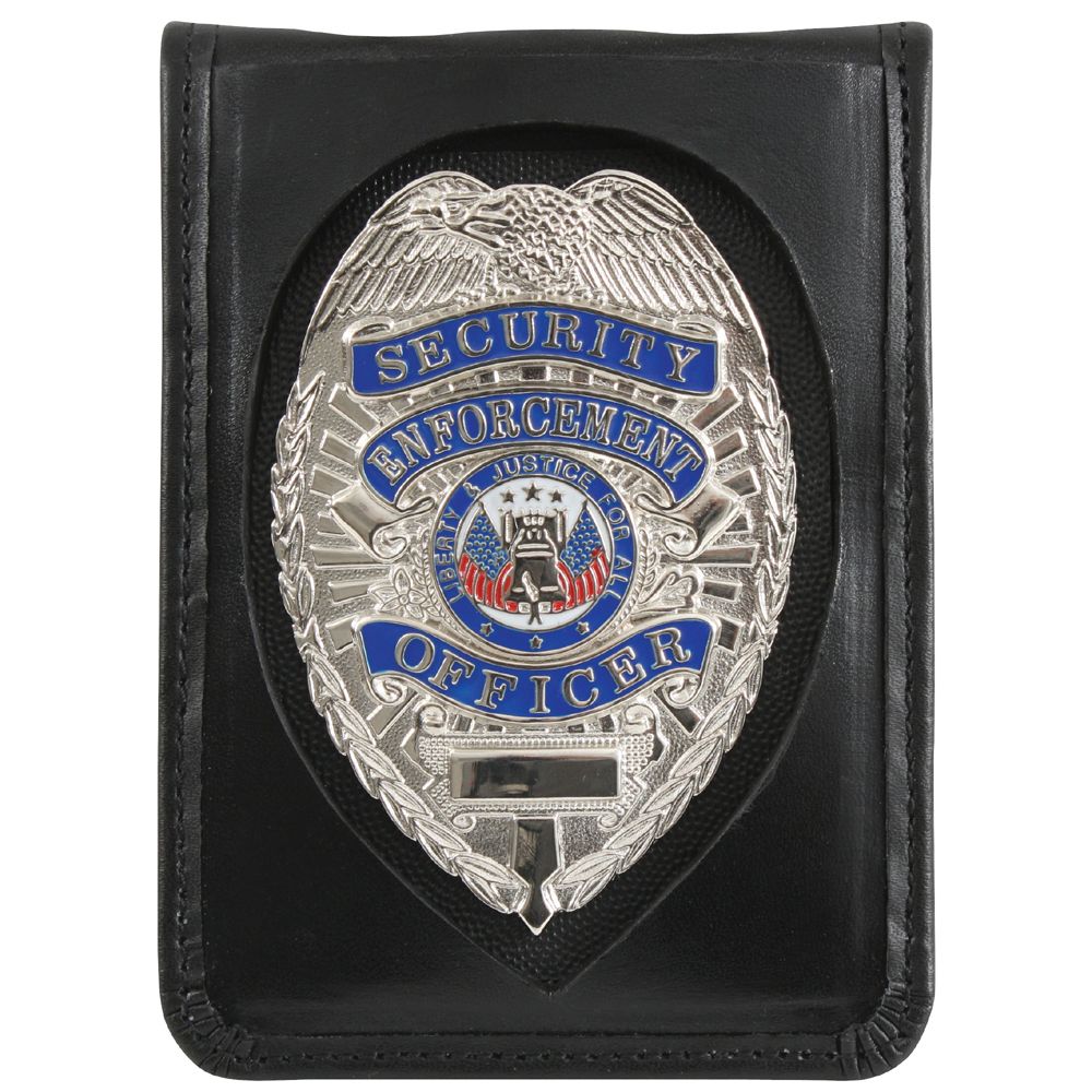 The Leather Neck Id Badge Holder from Ultra Force is made from very good quality leather and is quite durable. It is a bi fold holder and hence takes less space. It comes with a 33" ball chain and has metal grommets eyelets for chain. The best feature is that it has a clear pvc pocket to show your id on one side and a plastic insert cut out for badge on the other side. The badge cut out size is 2 1/2"w* 3 1/2"l. It has an interior hook and loop closure and a small pocket on the loop side for chain storage. It can be also accessorised with belts and can be worn on it.