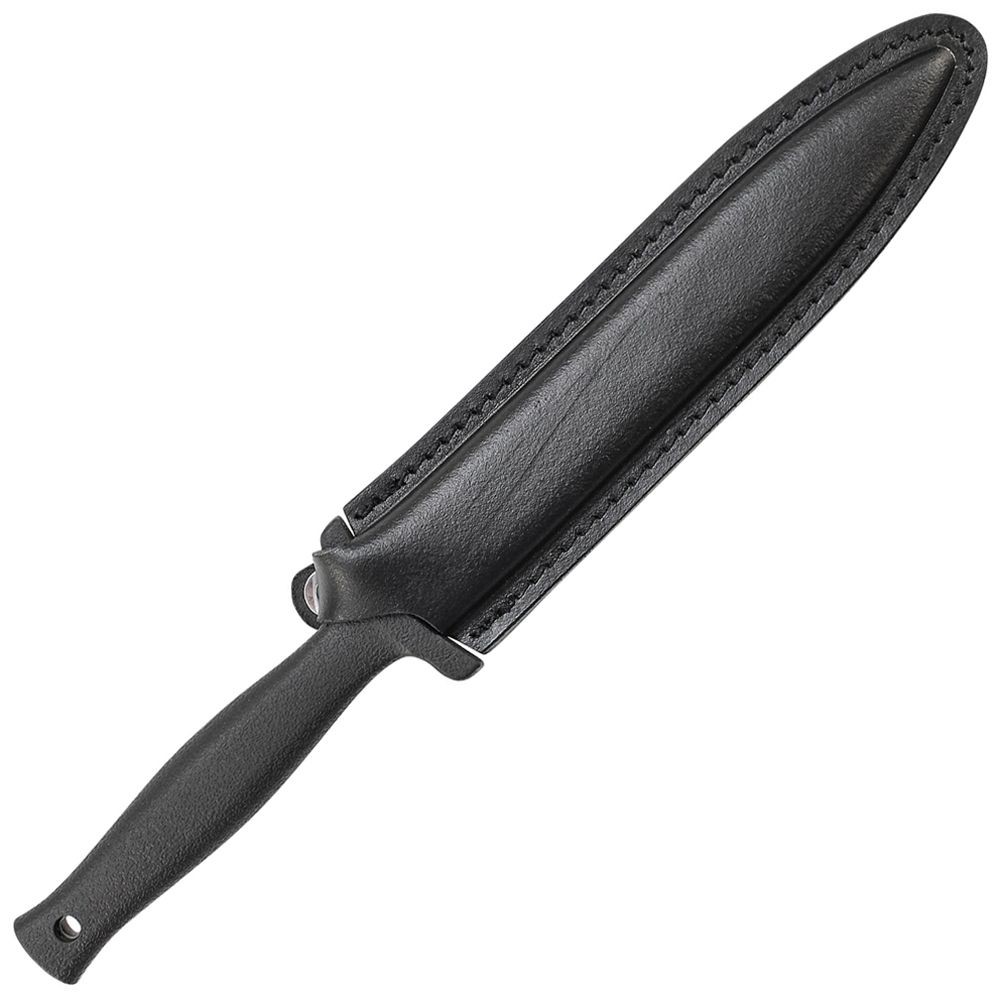 Schrade Boot Knife Fixed Blade, Black 7Cr17MoV High Carbon Stainless Steel Double Edged & Serrated Spear Point Blade with Blood Groove, Black Textured TPE Wrapped Handle with Lanyard Hole, Black Leather Sheath with Boot/Belt Clip.
