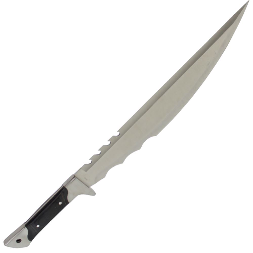 A Buckshot fantasy sword with some bite! Our Fantasy Warrior series combines full tang functionality with never before seen blade shapes. Hand polished stainless steel bolsters surround the black pakkawood handle. Two steel pegs secure the 440 stainless steel blade.