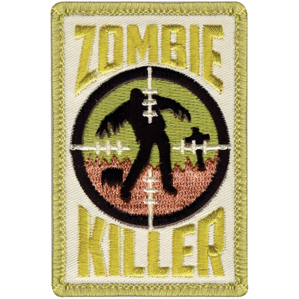 The Zombie killer patch along with hook back originates from Taiwan. It is a rectangular patch, which comes with embroidered design on it. You can find a zombie impression in an encircled target view, along with the word “Zombie Killer” embroidered on the patch. The fine embroidered border gives an elegant finish to the batch. It carries more that 6,500 stitches with a hook backing facility. The patch is intricately designed selecting the right colors making it a beautiful piece of craftsmanship. These patches can be easily hooked to your cap or a casual T-shirt to enhance its look. It comes in a 2 inch x 3 inch standard size.