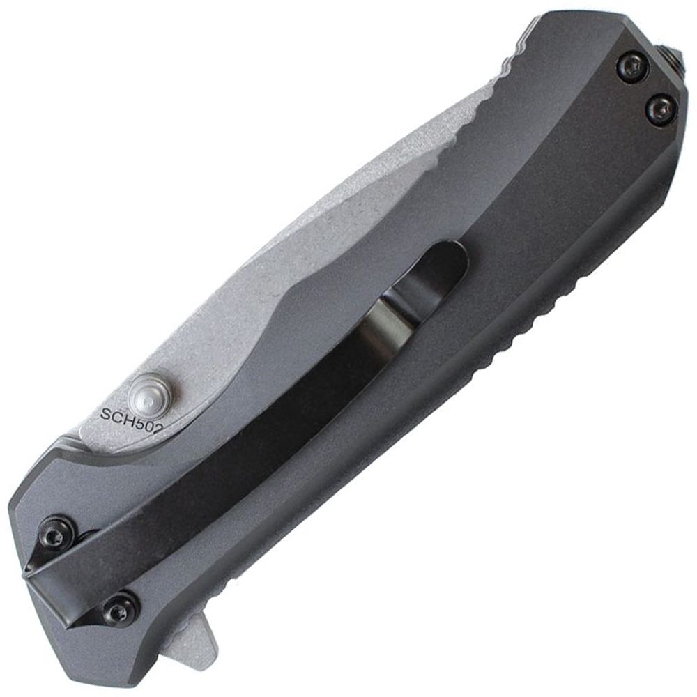 The Schrade 500 series of knives are tactically built utility folders with both style and function. The handle is a comfortably contoured aluminum with multiple runs of jimping for a secure hold in various grips. The thumb studs work equally as well as the flipper and the knife has the added bonus of a glass breaker on the butt end. This is a great knife design and is good looking to boot with the matte finished aluminum handle.