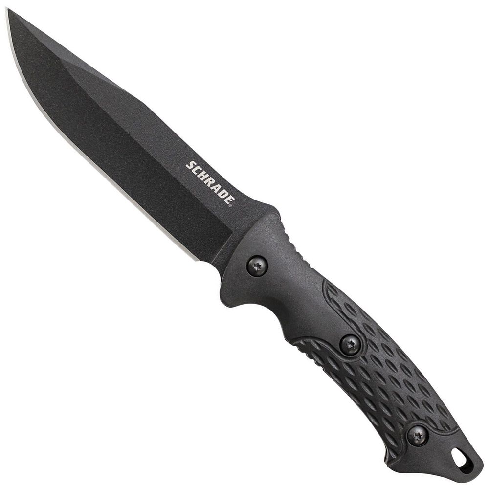 Schrade Full Tang Fixed Blade Knife, Black 8Cr13MoV High Carbon Stainless Steel Clip Point Blade Featuring Thumb Ramp with Jimping and Finger Guard, TPE Handle Slabs with Lanyard Oval, Multi-Carry Option Thermoplastic Belt Sheath with nine grommet holes and four slots for lashing to gear or pack.