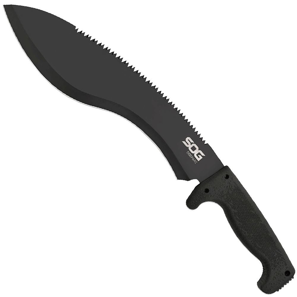 Whip them through the air and hear them sing. We've added a real working saw on the back of the 12.88-inch 3Cr13 black Cutlass blade with double ground teeth that cut deep. Extended out of the back of the rubber handle is a spiked tang for pounding and scraping. There are even holes in the handle to mount lanyards. SOGFari... the go to tool for survival, exploration and adventure!