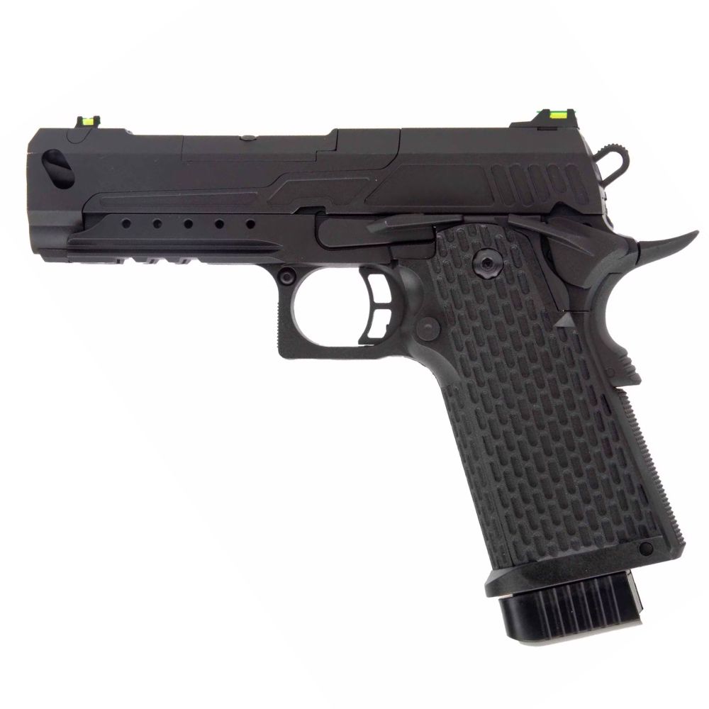 The SSP5 GBB Blowback Pistol - 4.3 inch is a pinnacle of sidearm engineering, combining precision with versatility. Featuring a customizable frame and advanced targeting options, it offers both iron sights and red dot compatibility. With its powerful 6.01mm inner barrel and ability to use heavy BBs, it delivers unmatched force and accuracy. Designed for durability with CNC machining and a steel trigger assembly, the SSP5 ensures reliability in any scenario, making it a leader among sidearms for both tactical missions and shooting practice.