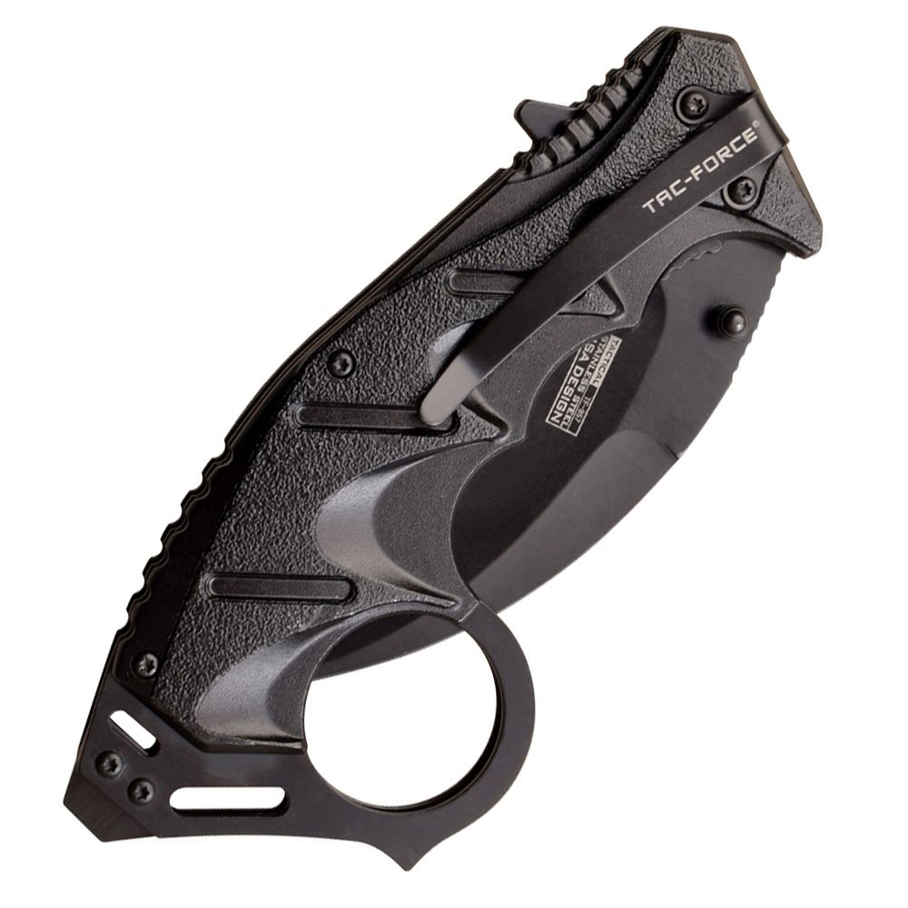 This Tac Force karambit Black pocket knife is a fantasy knife to have. This Tac Force karambit fantasy knife features a karambit stainless steel claw blade with aluminum handle with gold design. This fantasy karambit knife comes with a belt clip.