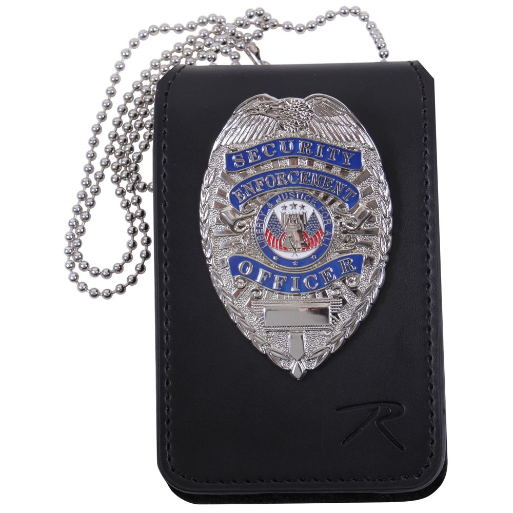 Rothco's Universal Leather Badge & ID Holder features a clear plastic window on one side, for ID card, and a spot for your badge on the other side. Great for law enforcement and public safety. There is no cutout area for the badge so that you aren't limited to one size or style badge; a truly universal design. The badge holder also features a 33" chain for wearing your badge around your neck. Badge sold separately.