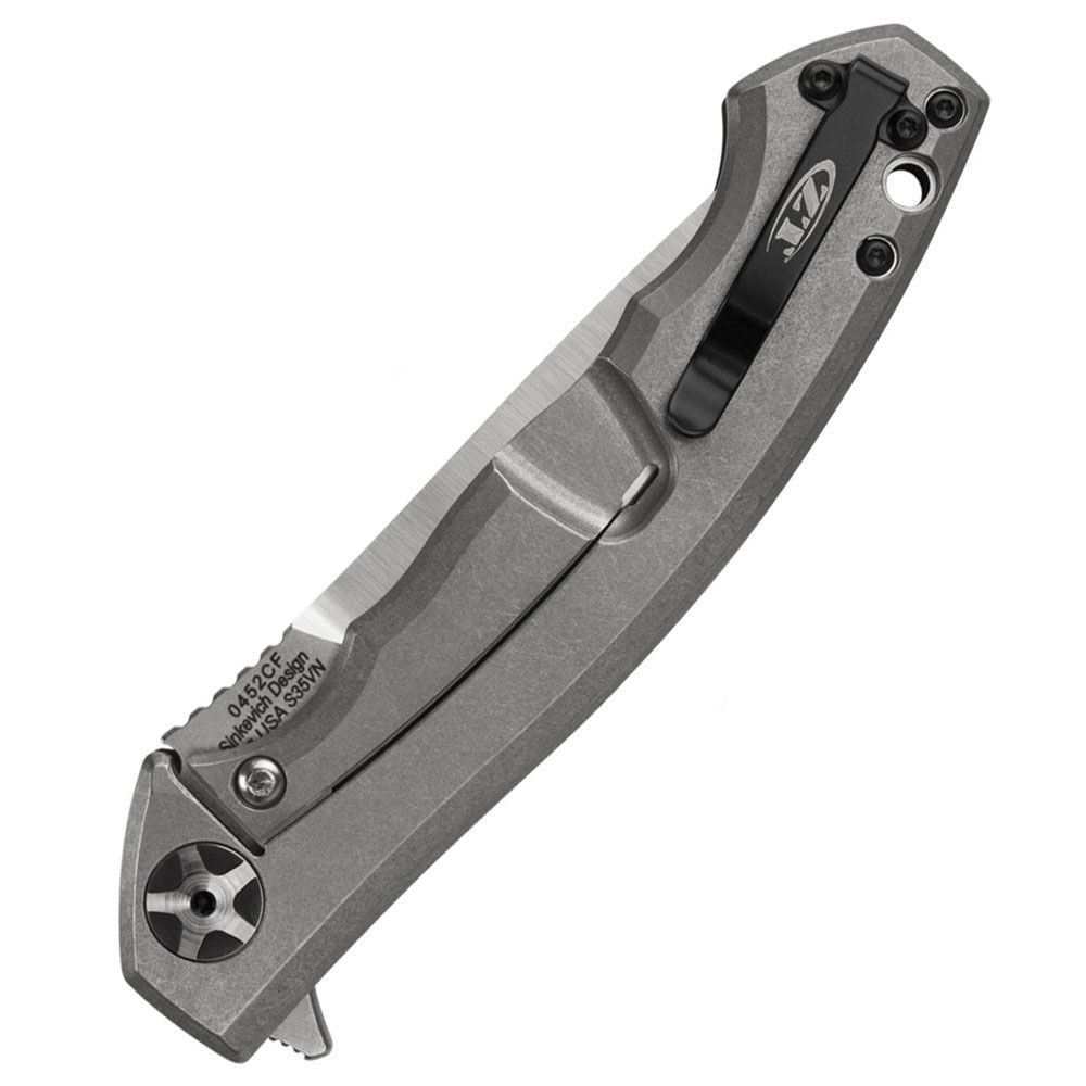 To make this amazing knife more readily available, ZT has created a new-for-2015 version based on the original’s streamlined form and high-performance function. The 0452CF is the same size as the original 0454, but with a carbon fiber front scale and S35VN dual-finished blade. S35VN sharpens to a razor edge, holds it, and can be resharpened easily. The 0452CF opens as smooth as butter with the KVT ball-bearing opening system and built-in flipper. A titanium frame lock with hardened steel lockbar insert ensures solid lock up